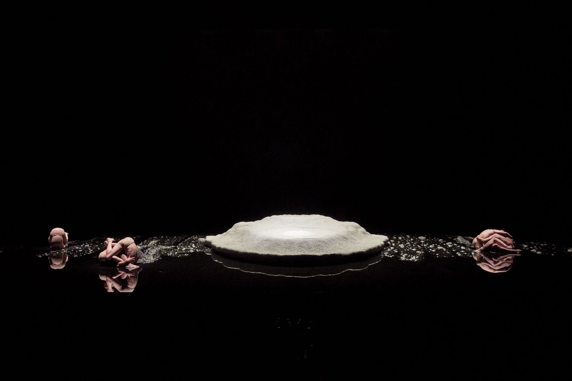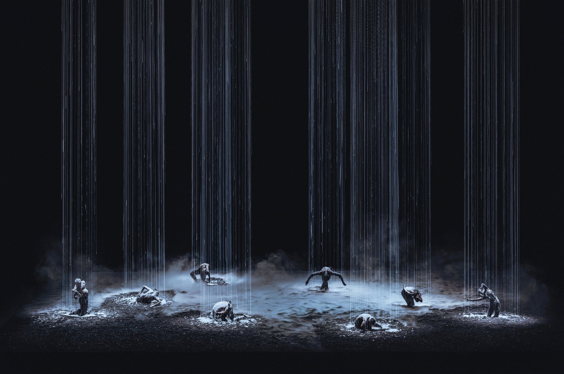 2021 年 9 月にパリで初演。光を反射する黒い砂のランドスケープを背景に、地を這う霧や降り注ぐ粘度 の高い液体が気象現象のように舞台を包み込む。その中で、植物のように⾵に揺れるダンサーたちの身 体表現が印象的。